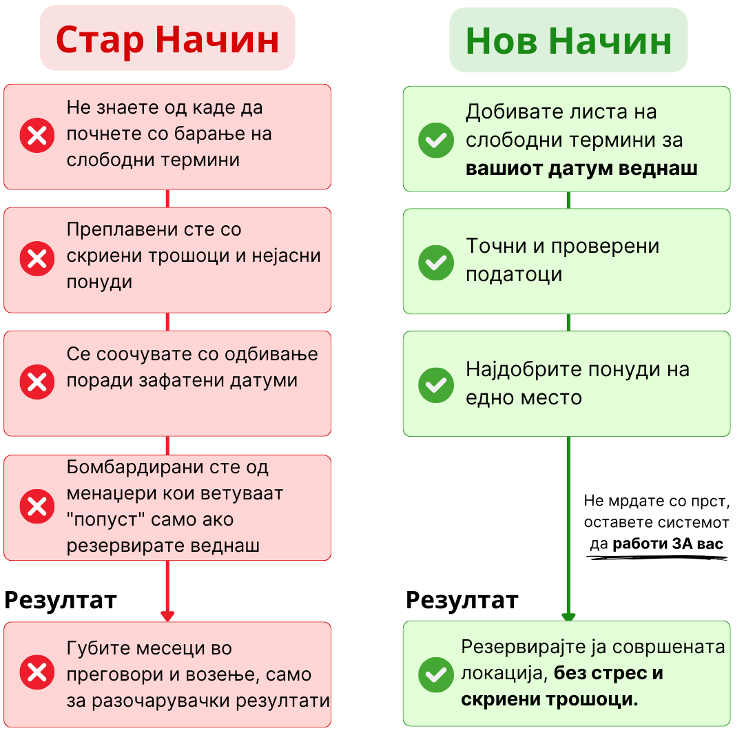 Prestani da vrtish telefoni. Popolni go prashalnikot (trae 30 sekundi) i dobij lista na lokacii koi se slobodni za tvojot datum i odgovaraat na tvojot budzhet